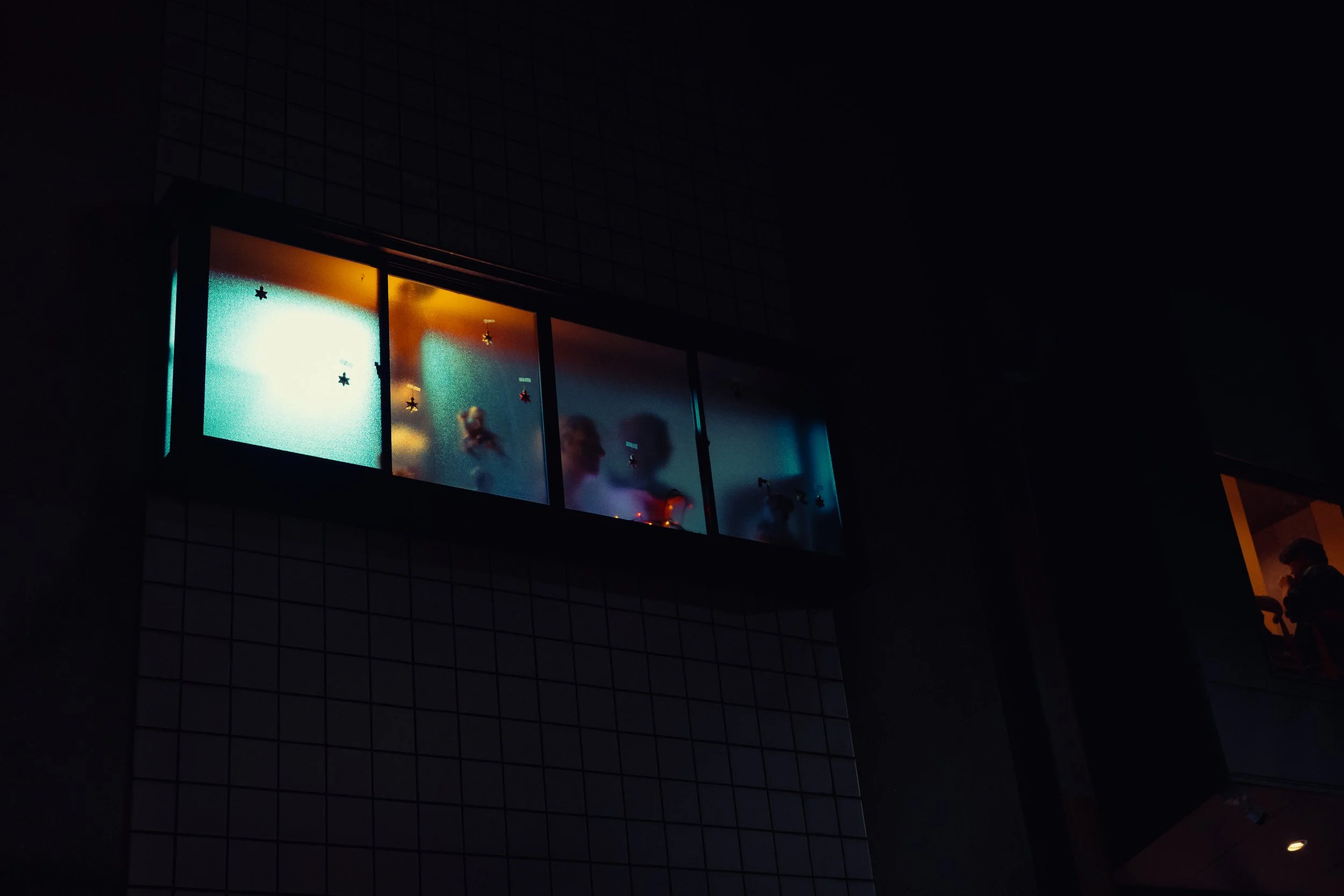 Une façade de bâtiment avec une fenêtre sur l'étage supérieur, éclairée de l'intérieur, avec des silhouettes de personnes derrière la buée sur la vitre.