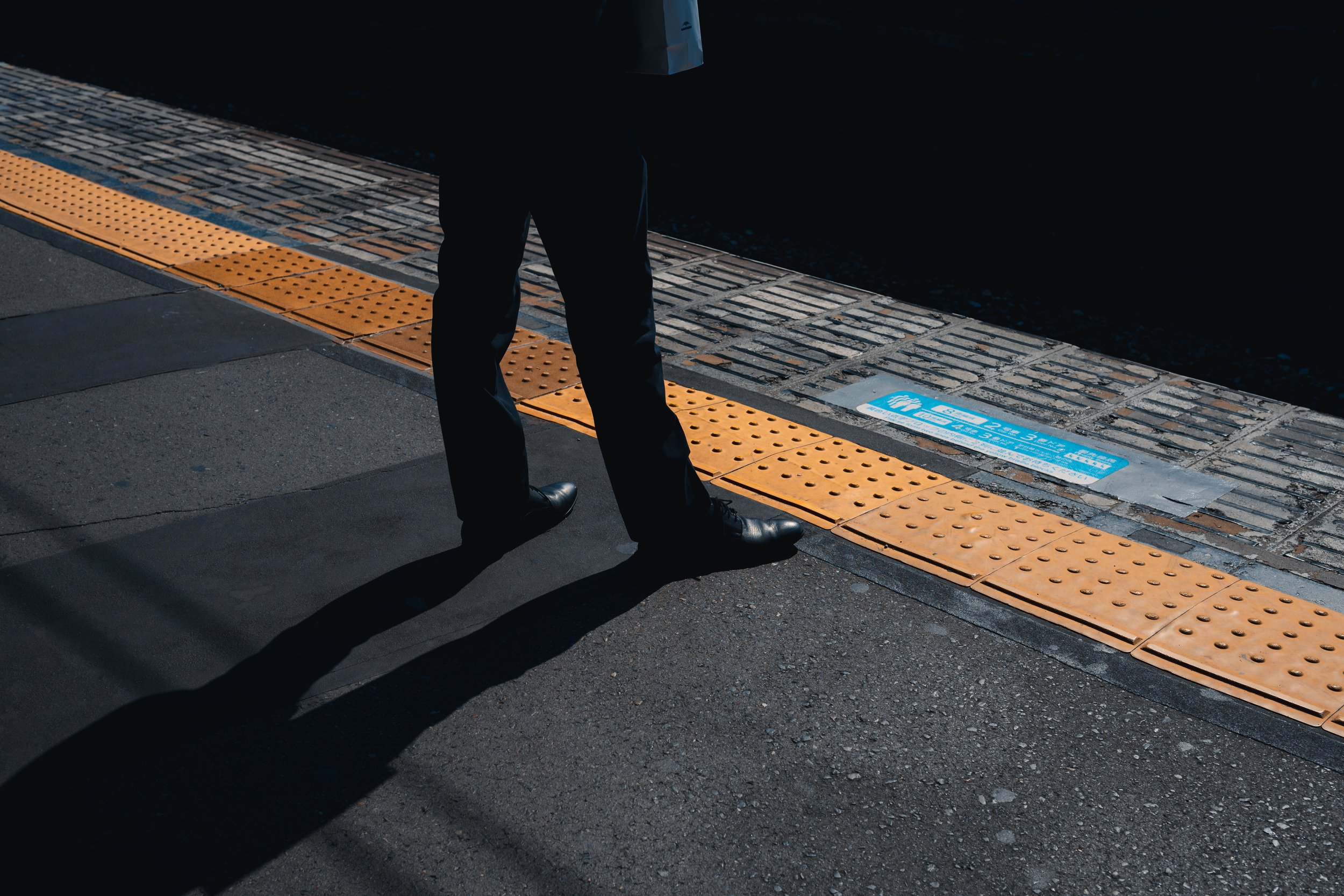 Un homme en costume noir se tient sur un trottoir près du quai d'une gare, avec l'ombre de sa silhouette et de sa moustache visible sur le sol. Le quai est bordé d'une bande tactile en jaune et une affiche de sécurité est visible au sol.