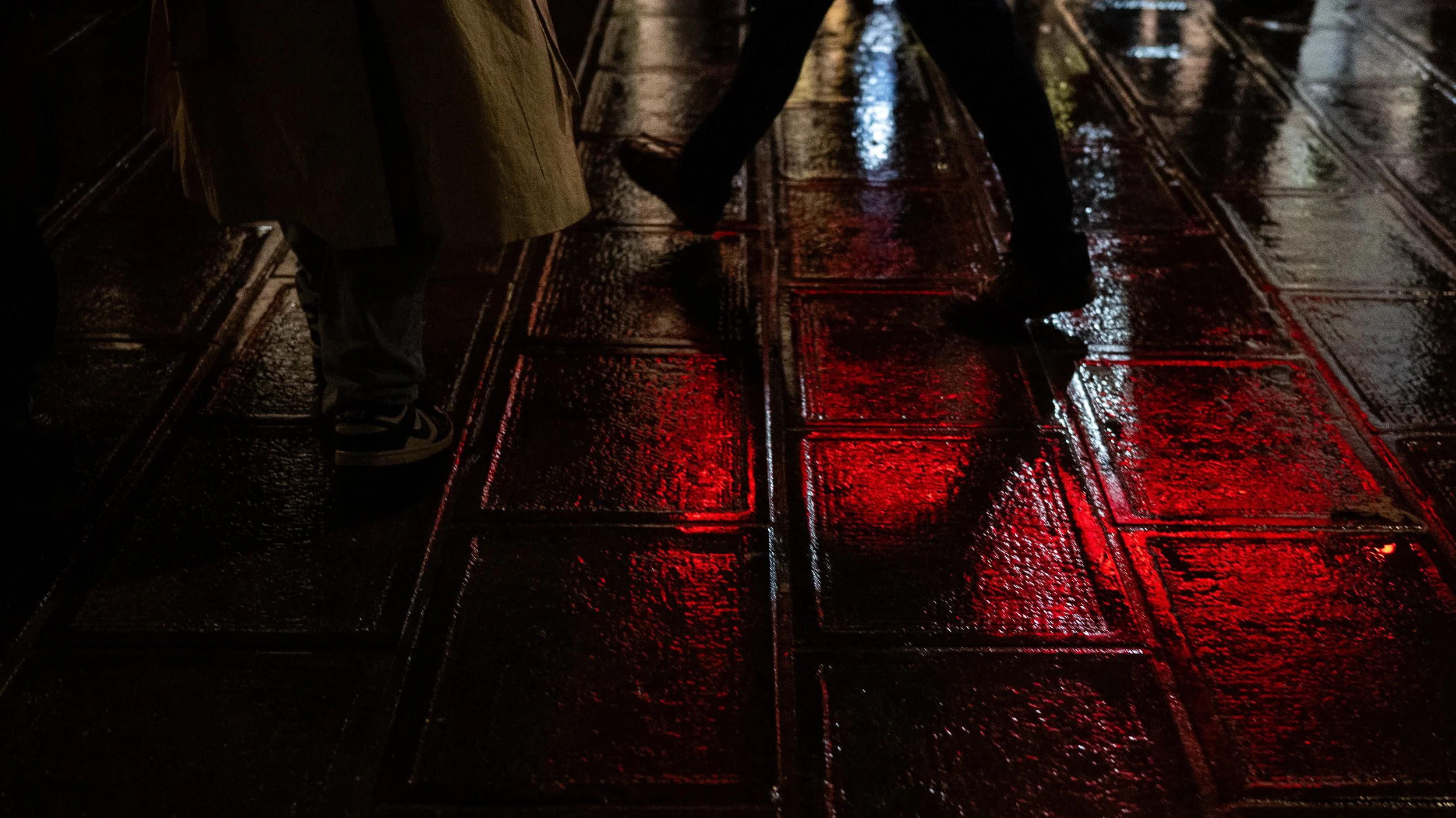 Silhouettes de personnes marchant sur un trottoir mouillé la nuit, reflétant des lumières rouge et bleue. Voir en taille réelle