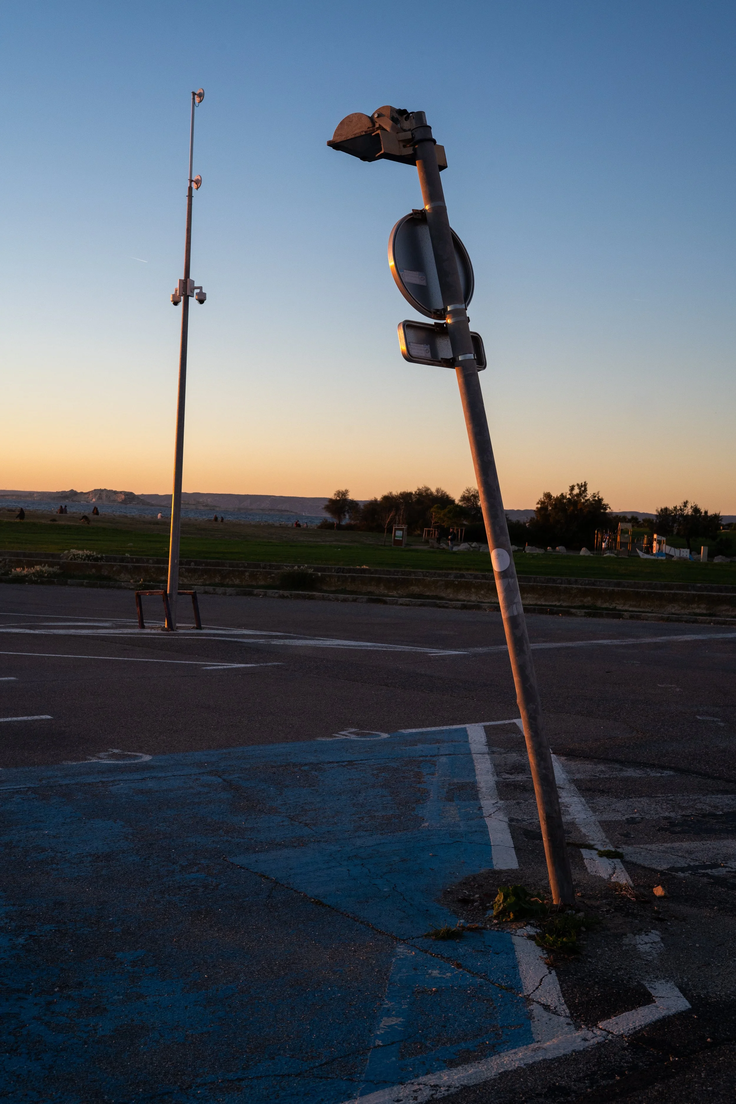 Un panneau de stationnement endommagé incliné dans un parking en plein air au coucher du soleil, avec un ciel dégagé et un paysage de campagne en arrière-plan. Voir en taille réelle
