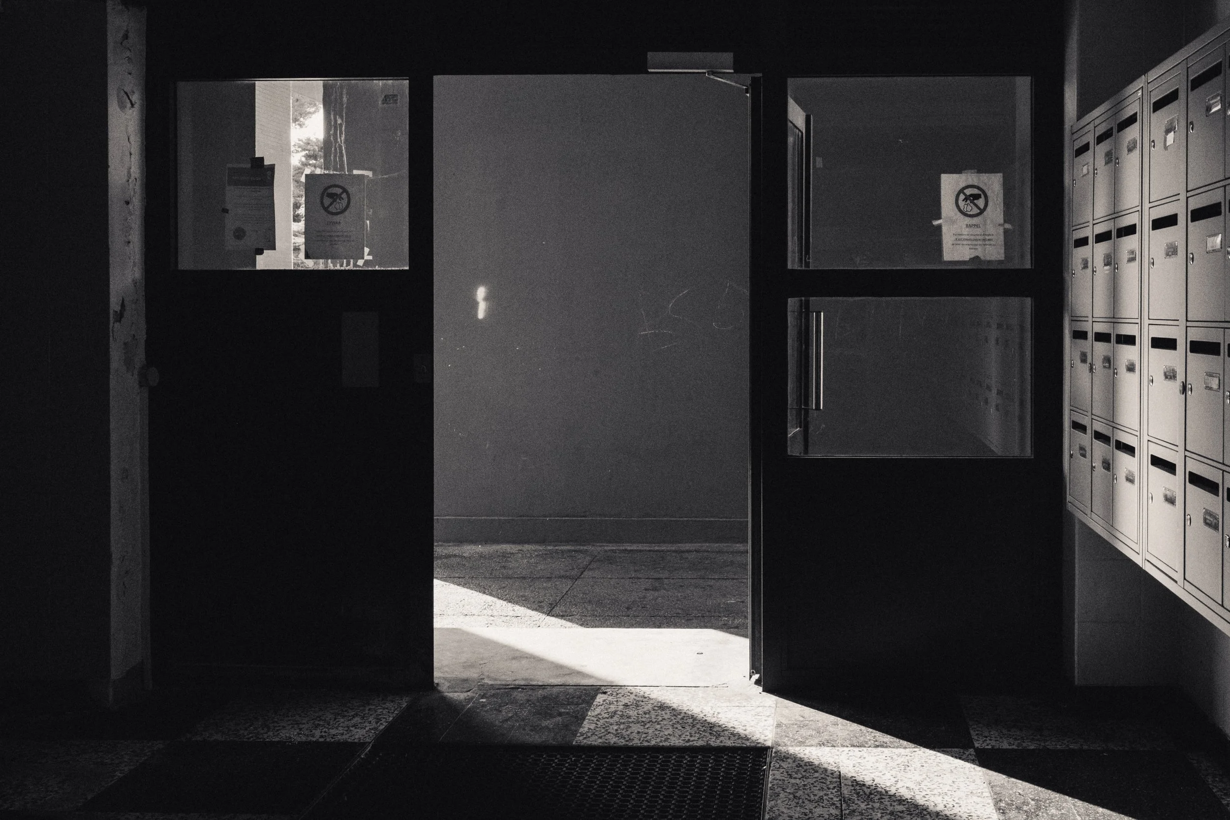 Entrée sombre d'un bâtiment avec portes ouvertes laissant passer la lumière naturelle, et des casiers à la droite, avec une affiche et des stickers interdisant de fumer, en noir et blanc. Voir en taille réelle