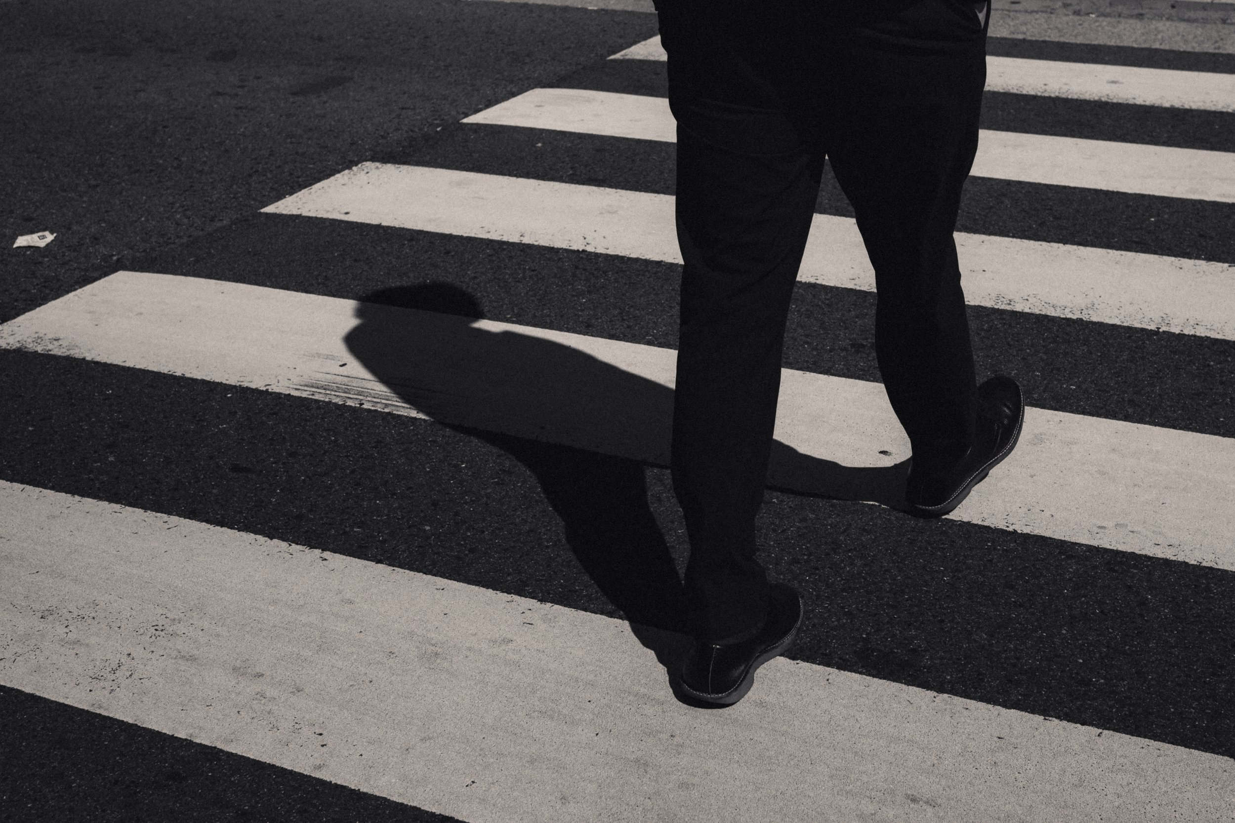 Une personne marche sur un passage pour piétons, vue de derrière, avec une ombre projetée sur la chaussée