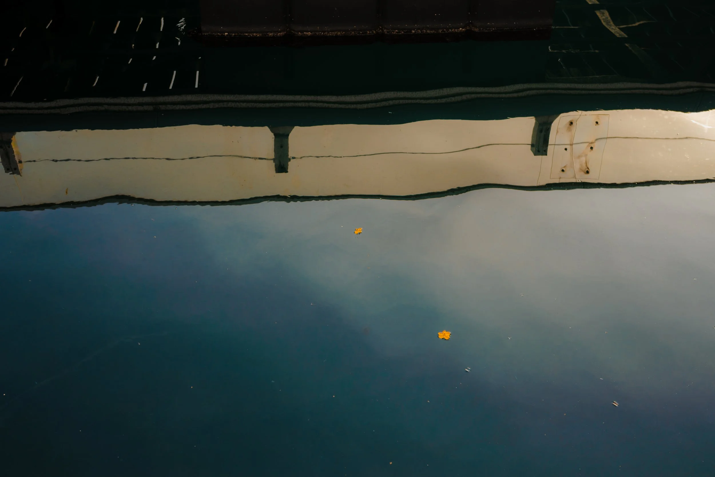 Reflet d'un bâtiment blanc et d'un ciel bleu dans l'eau, avec deux feuilles jaune-orange flottant à la surface.