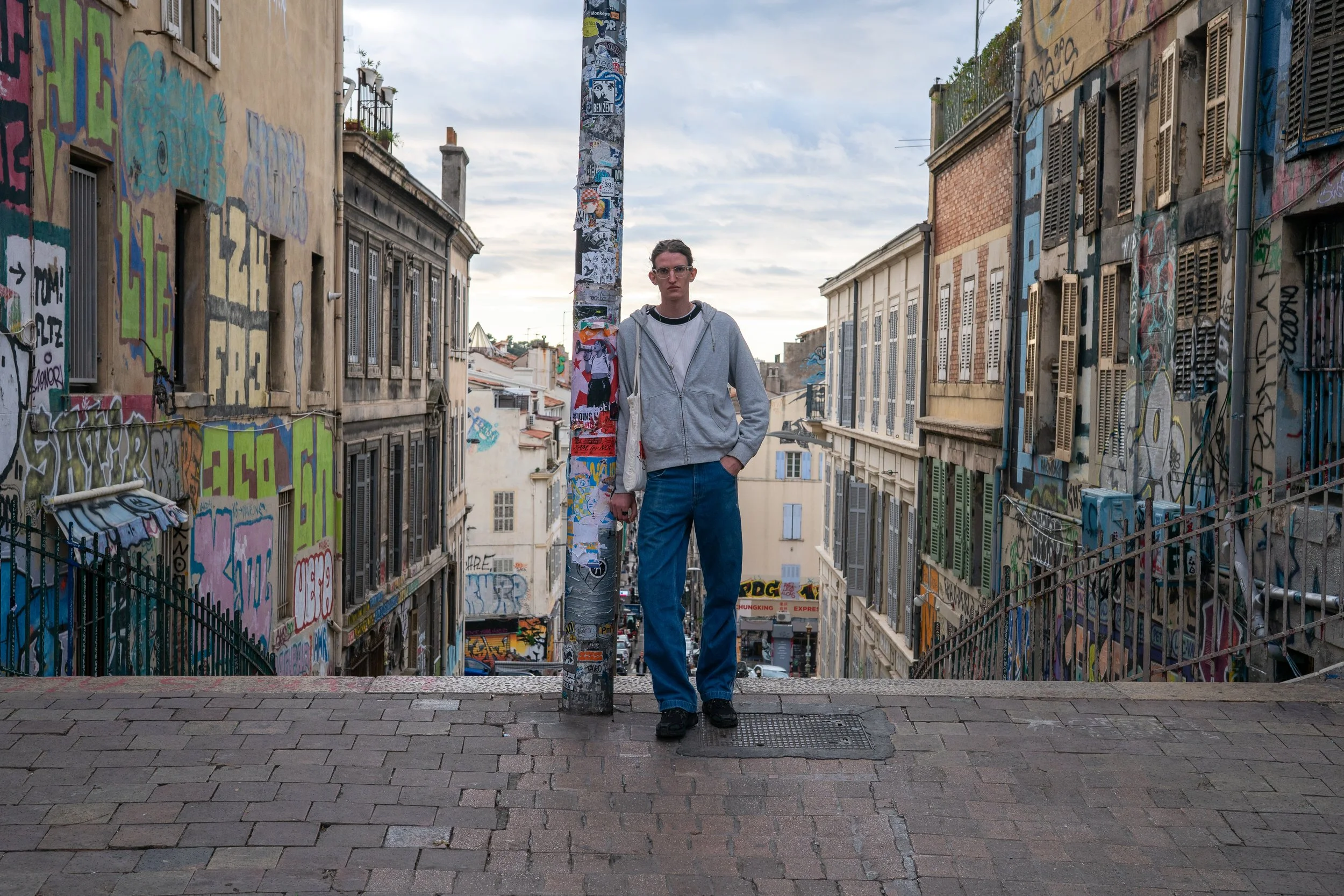 Une personne debout face à la caméra dans une rue urbaine avec des bâtiments graffiti et un lampadaire couvert de stickers.