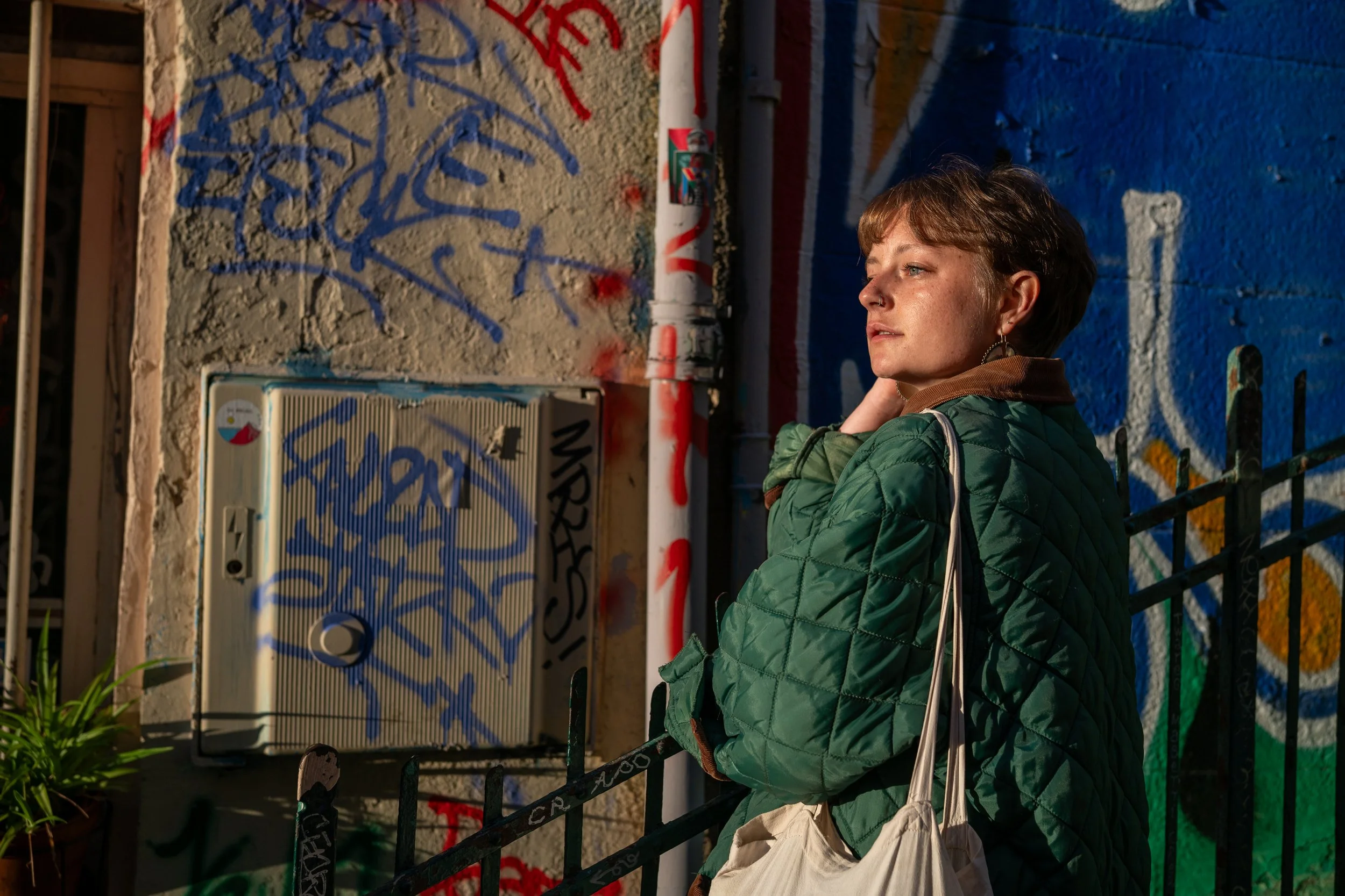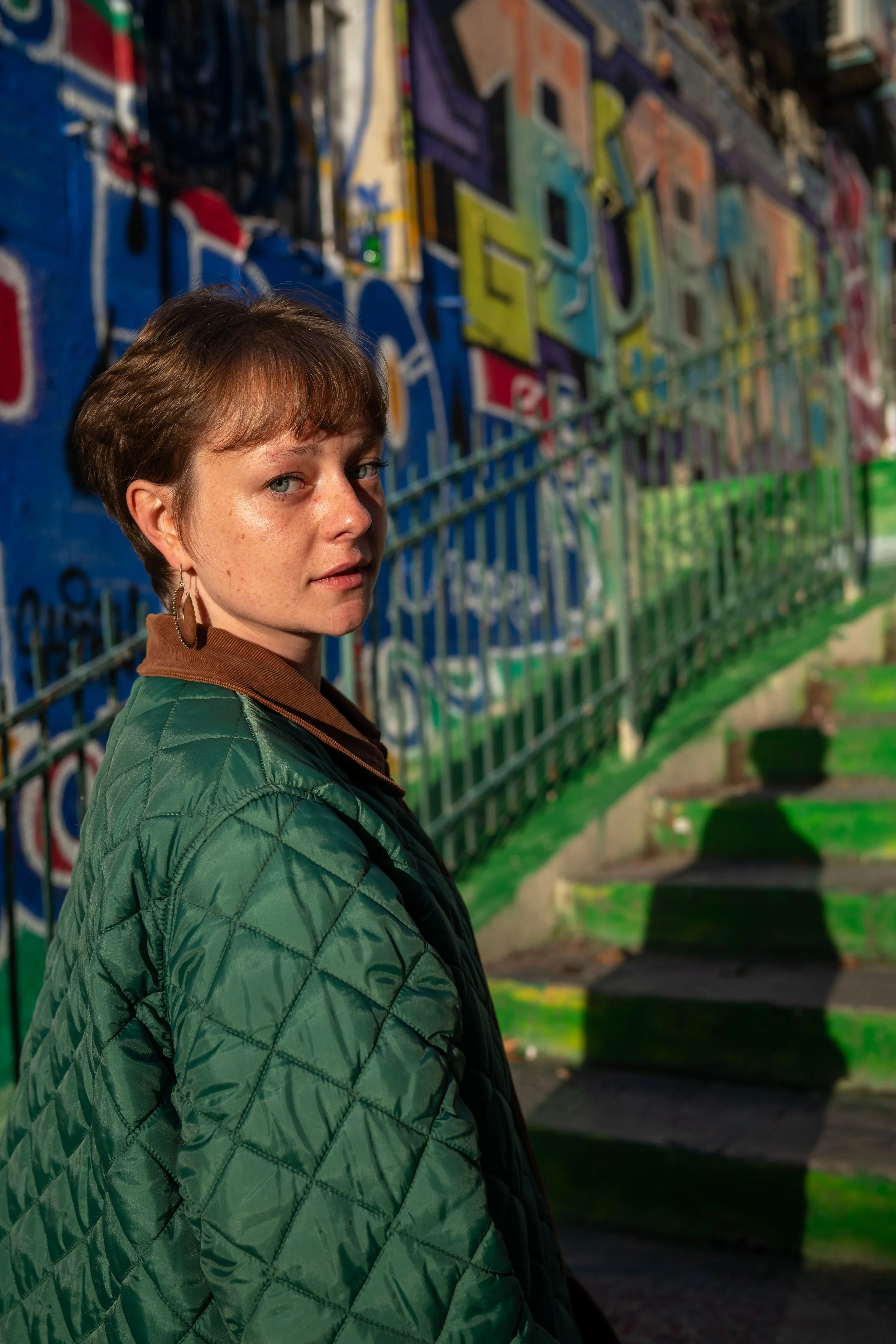 Jeune femme avec veste en quilté vert pâle, boucles d'oreilles en forme de cercles, fond avec graffiti coloré sur un mur, escaliers avec ombres longues, en plein jour.