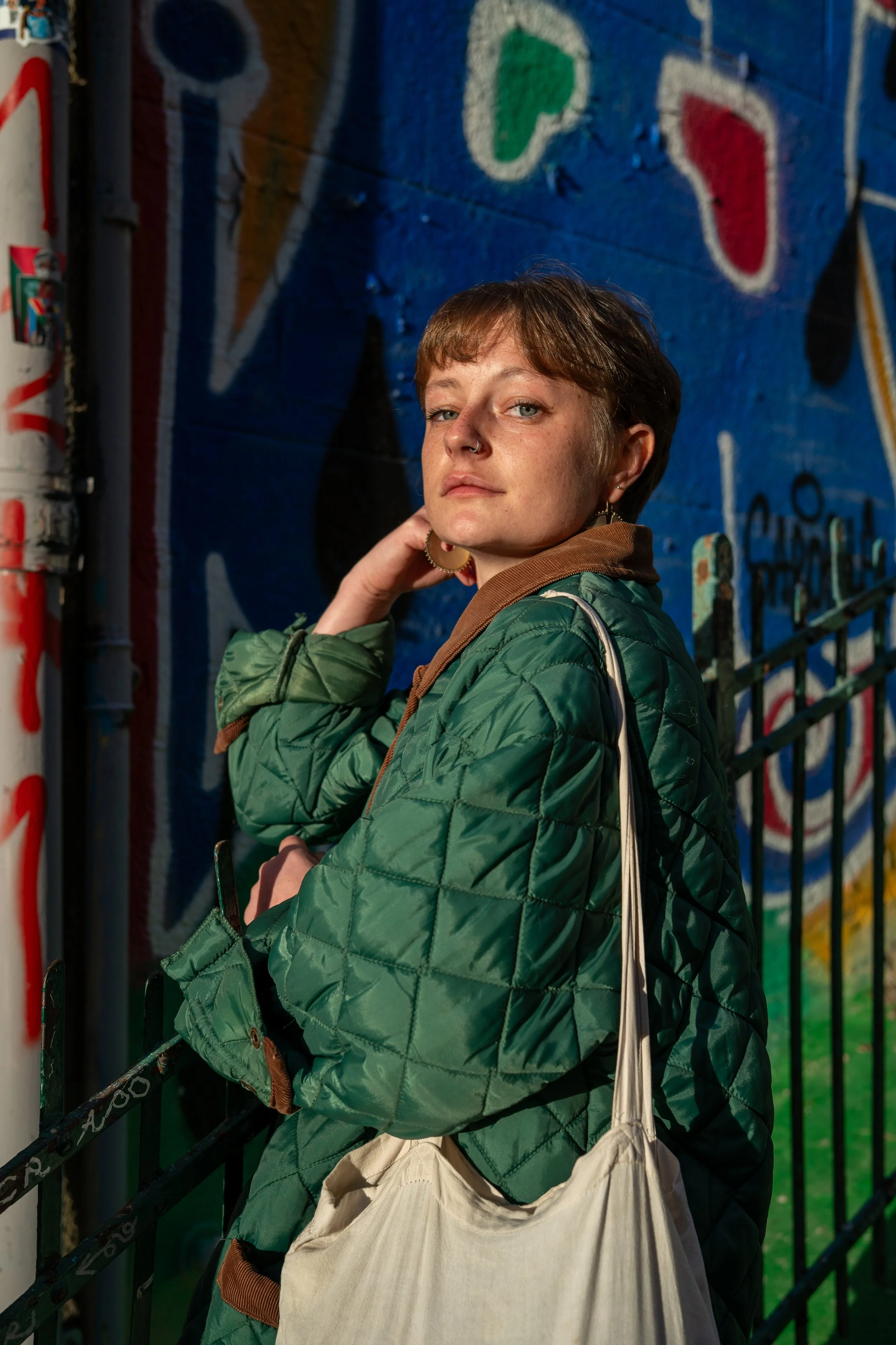 Jeune femme avec une veste verte foncée, portant un sac en toile beige, se tenant devant un mur graffiti coloré.