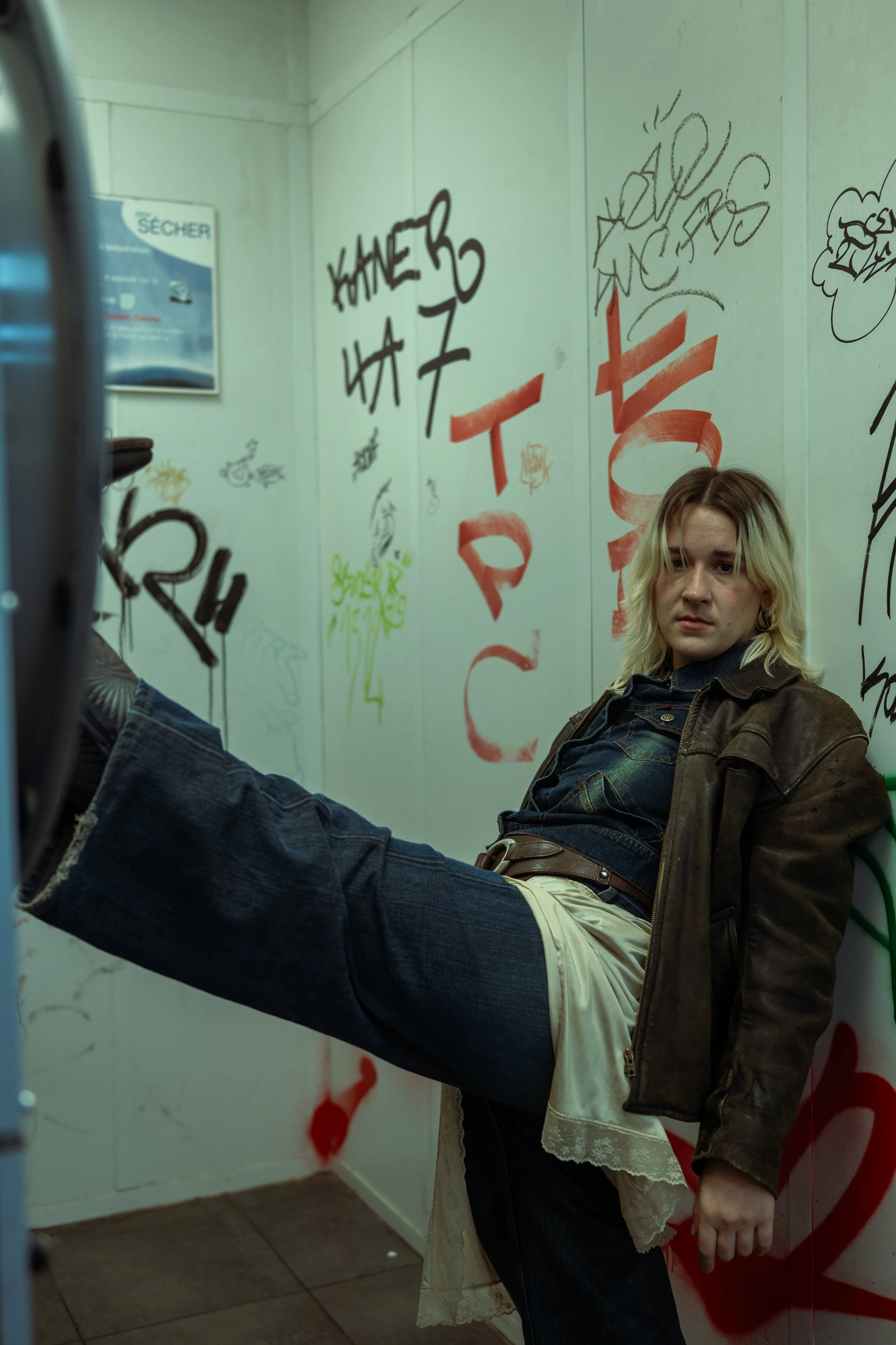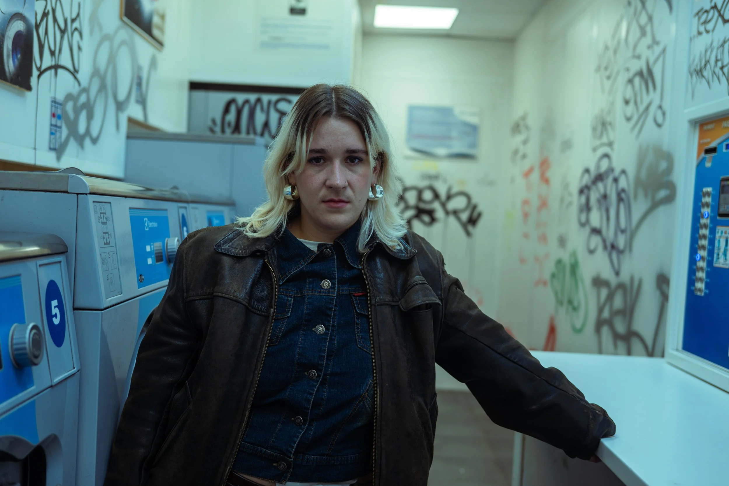 Une jeune femme avec des cheveux blond décolorés, portant un blouson en cuir et un jean, se tient dans une laverie automatique avec des murs couverts de graffitis.