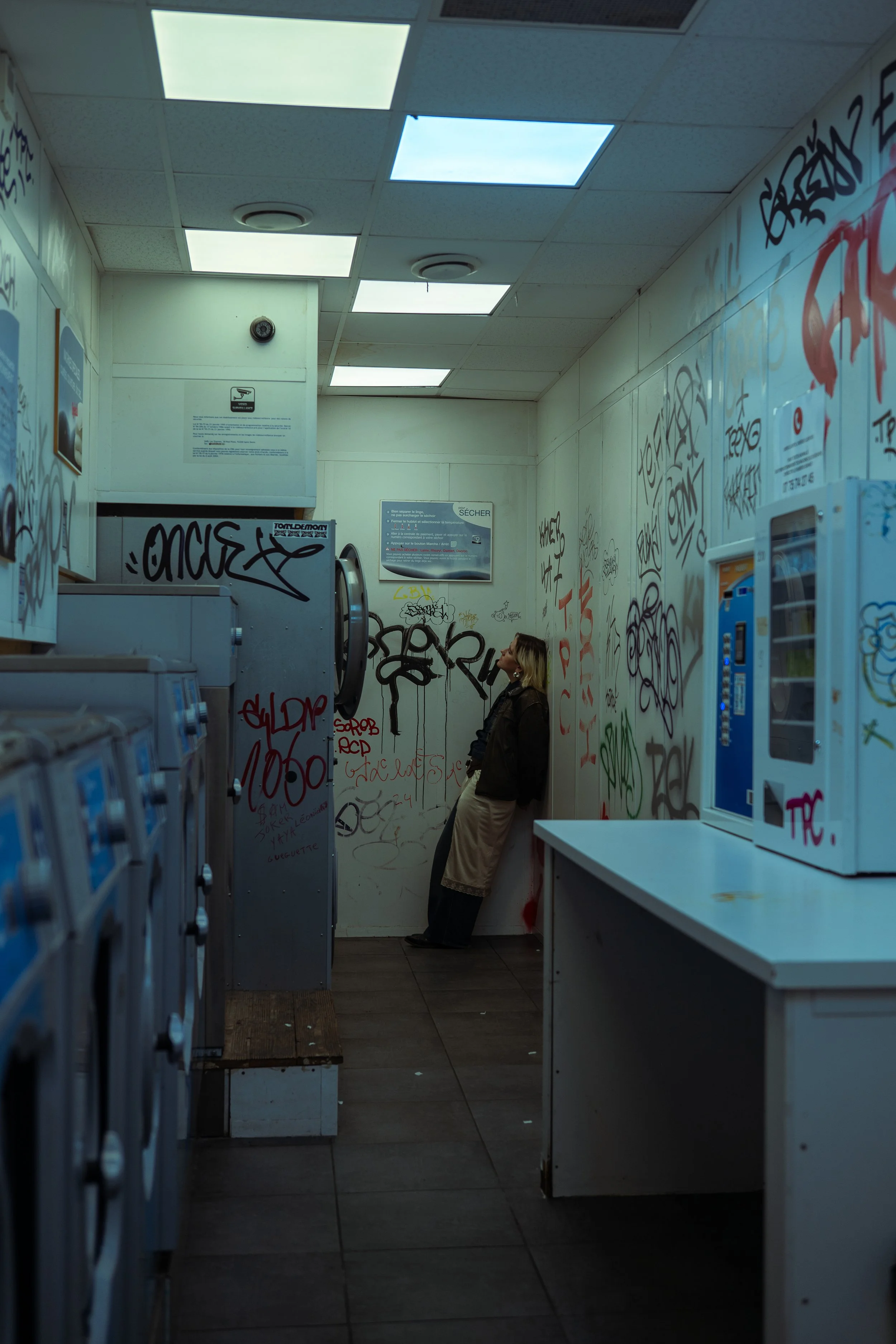 Une femme dans une laverie automatique, assise contre un mur graffiti, à côté de machines à laver.