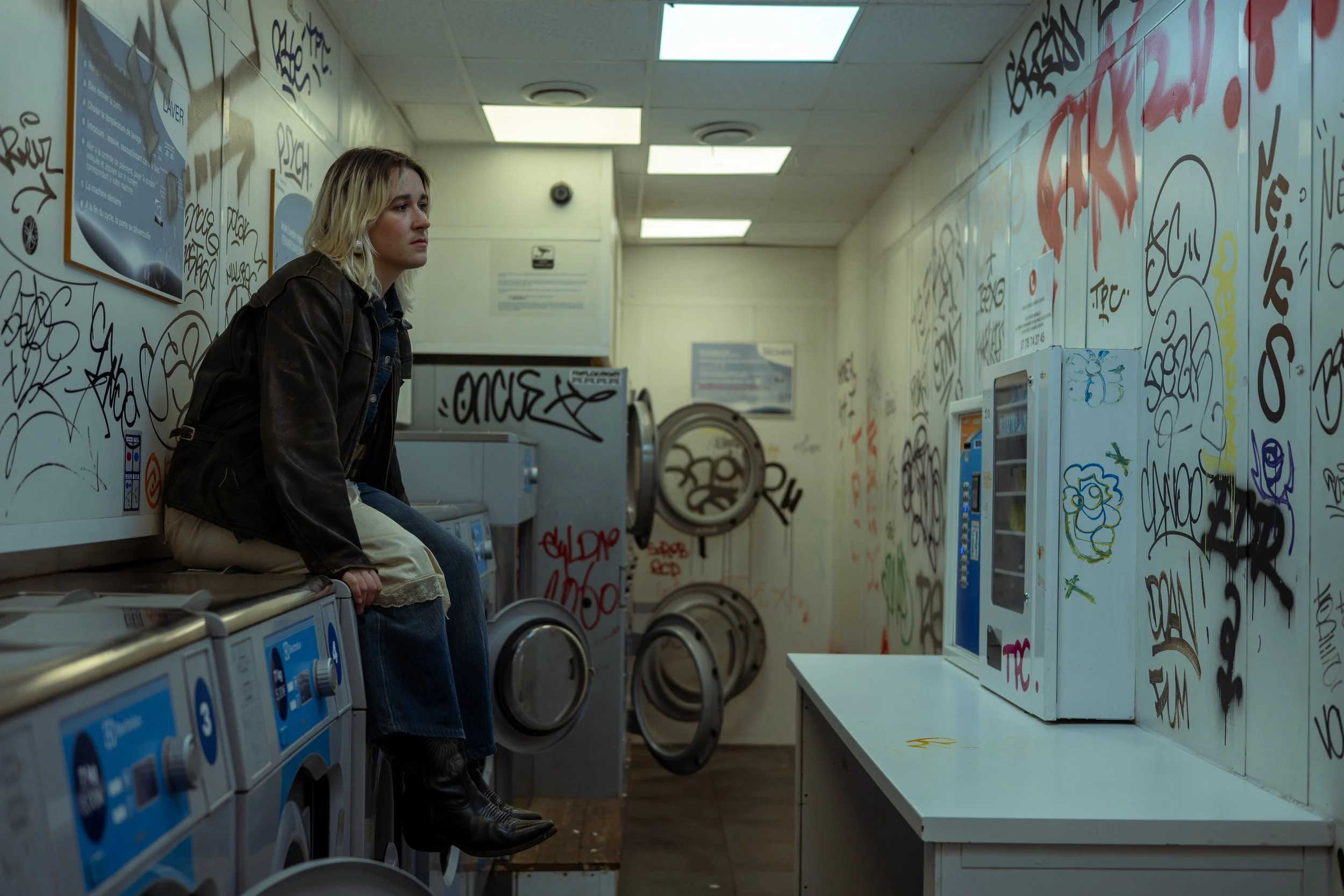Une jeune femme blonde assise sur une machine à laver dans une laverie automatique ouverte, entourée de murs couverts de graffitis. Elle porte une veste en cuir sombre, une robe claire et des bottes noires, et regarde pensivement.