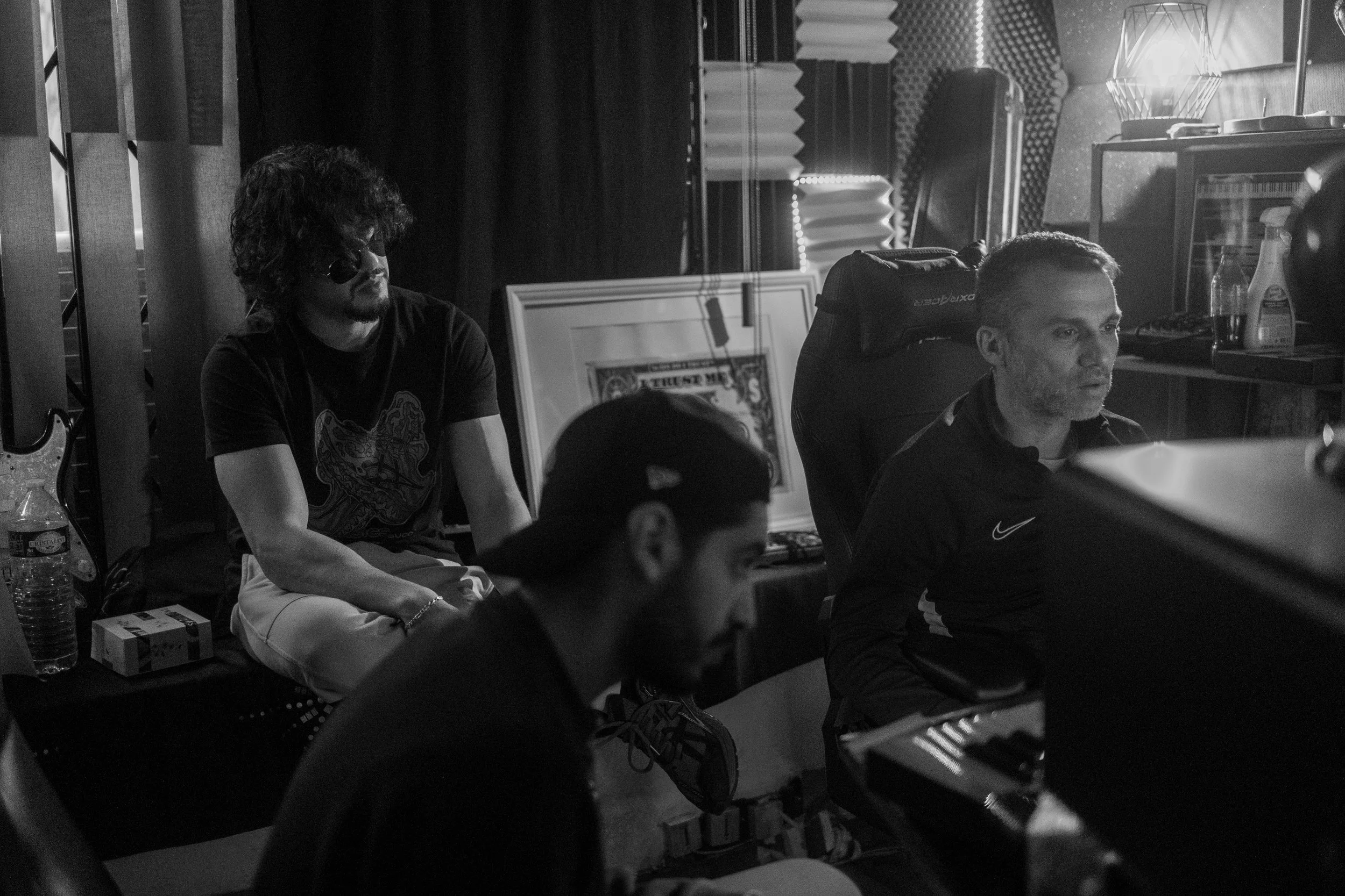 Trois hommes en studio d'enregistrement ou en salle de musique, avec des équipements et des posters dans le fond, en noir et blanc.