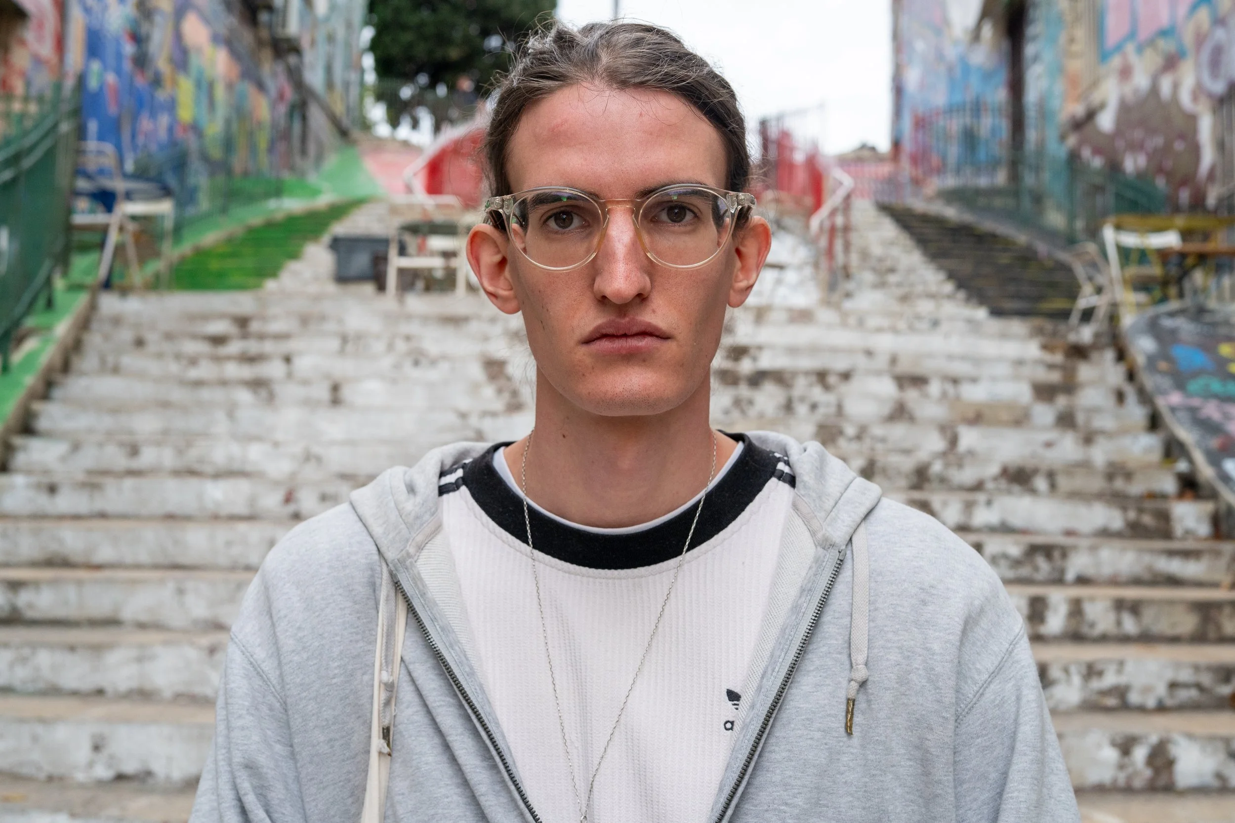 Jeune homme portant des lunettes transparentes, un t-shirt blanc et un sweat gris, debout devant une escalier graffité.