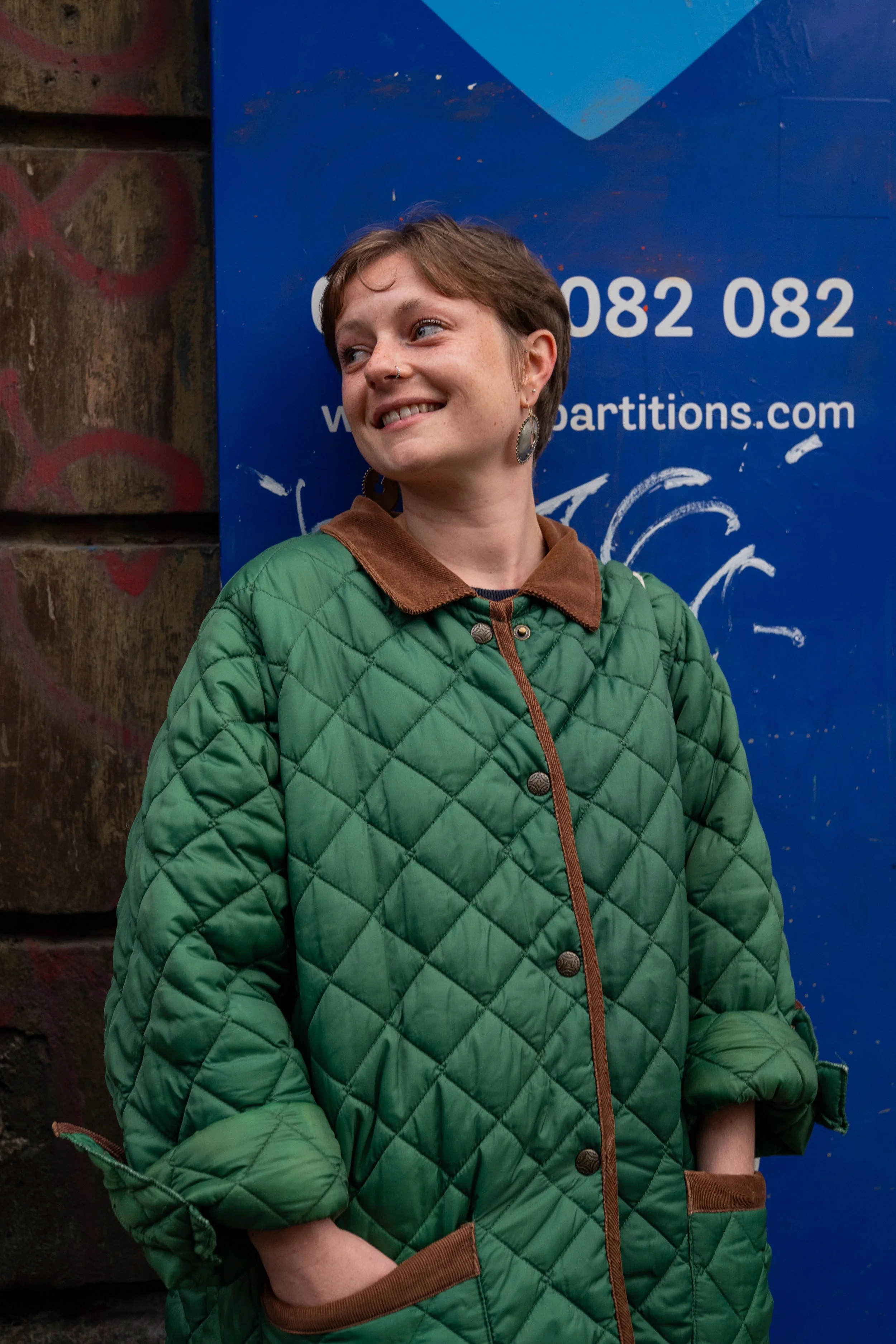 Une jeune femme souriante porte une veste matelassée verte avec des accents marron, se tient devant un panneau bleu avec des inscriptions en français. Voir en taille réelle