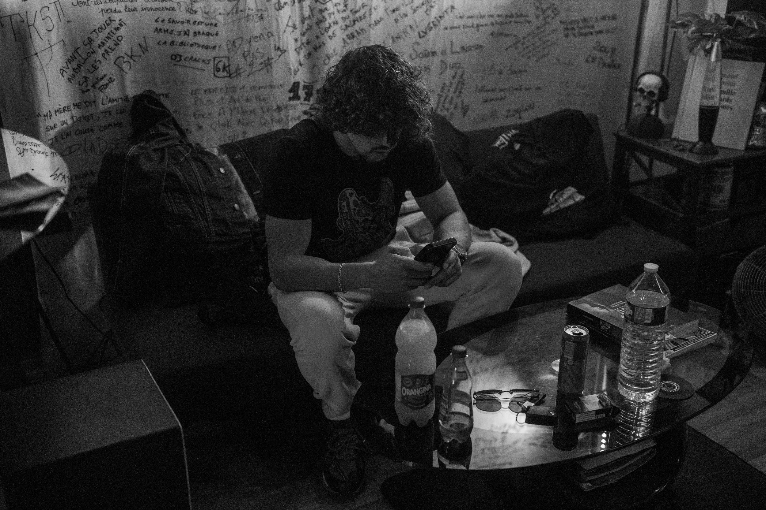 Jeune homme assis sur un canapé lisant son téléphone, dans une pièce sombre, avec des bouteilles, des livres, une paire de lunettes et une boîte de cigarettes sur la table devant lui, mur recouvert de graffiti et objets divers en arrière-plan.