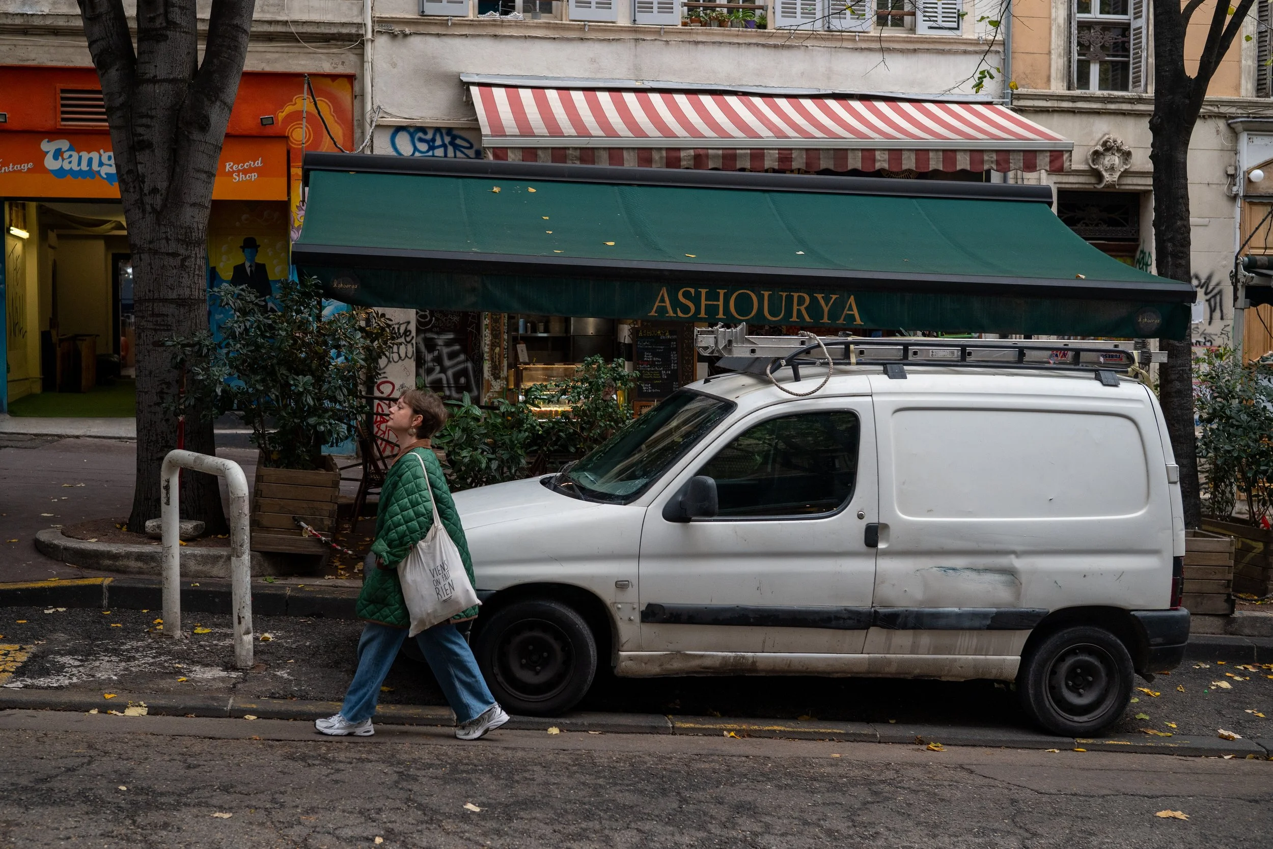 Une femme marche devant un petit véhicule blanc stationné près d'un restaurant avec une enseigne verte portant le nom "Ashourya". La scène se déroule dans une rue urbaine avec des arbres et des graffitis sur les murs.