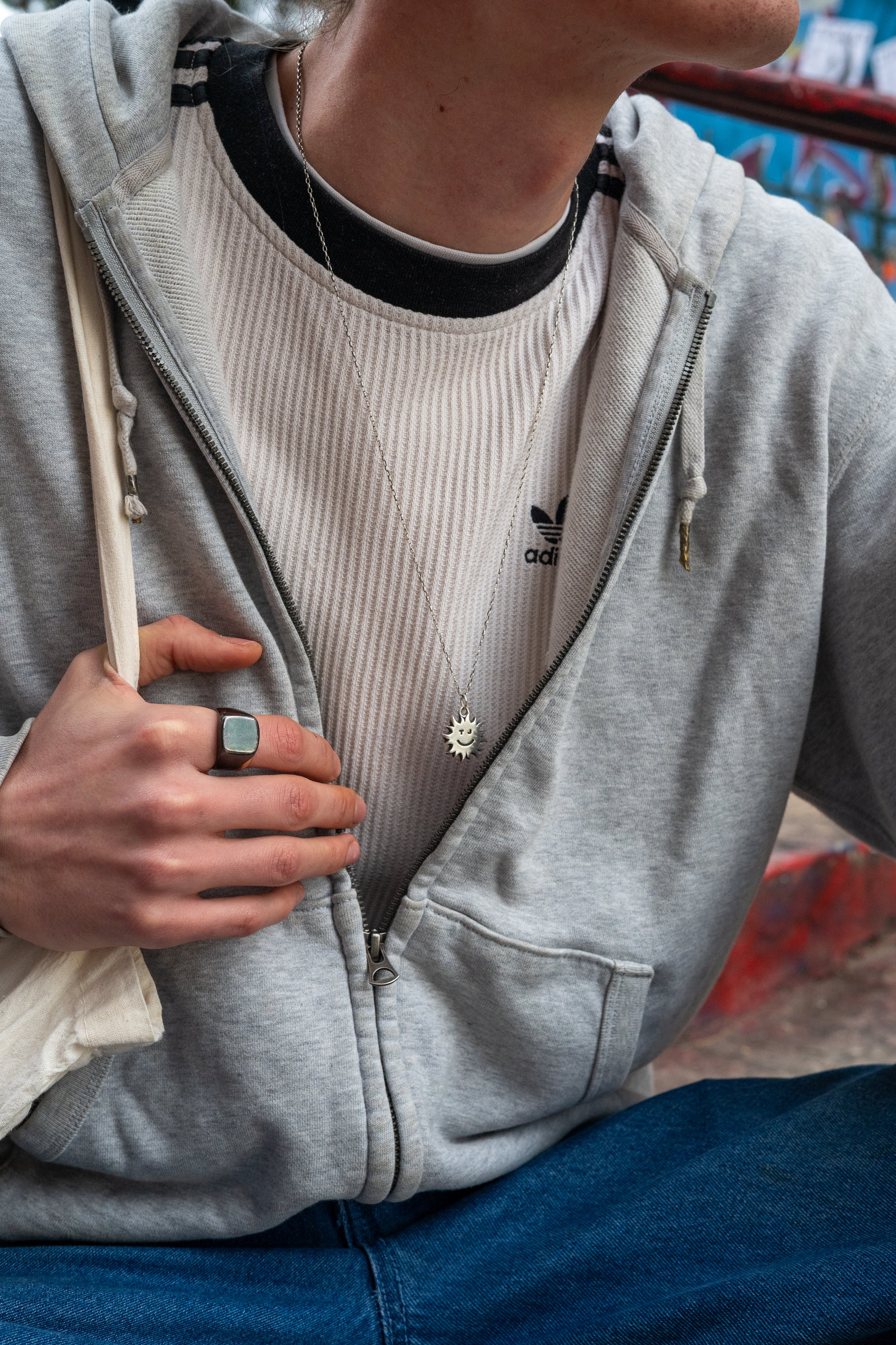 Homme portant un sweat à capuche gris, un t-shirt blanc avec un logo Adidas noir, et une montre en argent, avec une chaîne avec un pendentif en forme de soleil